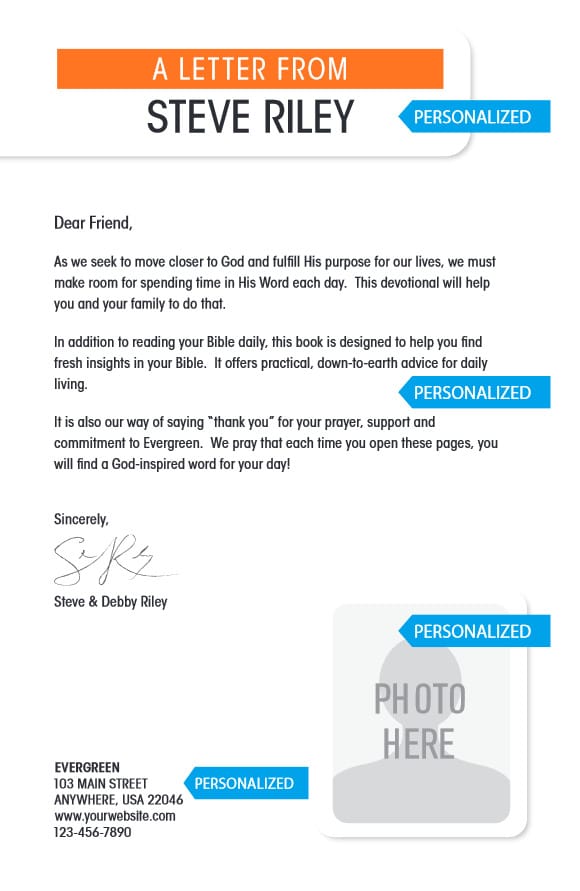 For as few as 100 copies a quarter, this devotional can be branded with your ministry name, logo, website, and social media links, an encouraging letter and photo from your CEO, along with your ministry address and contact information.